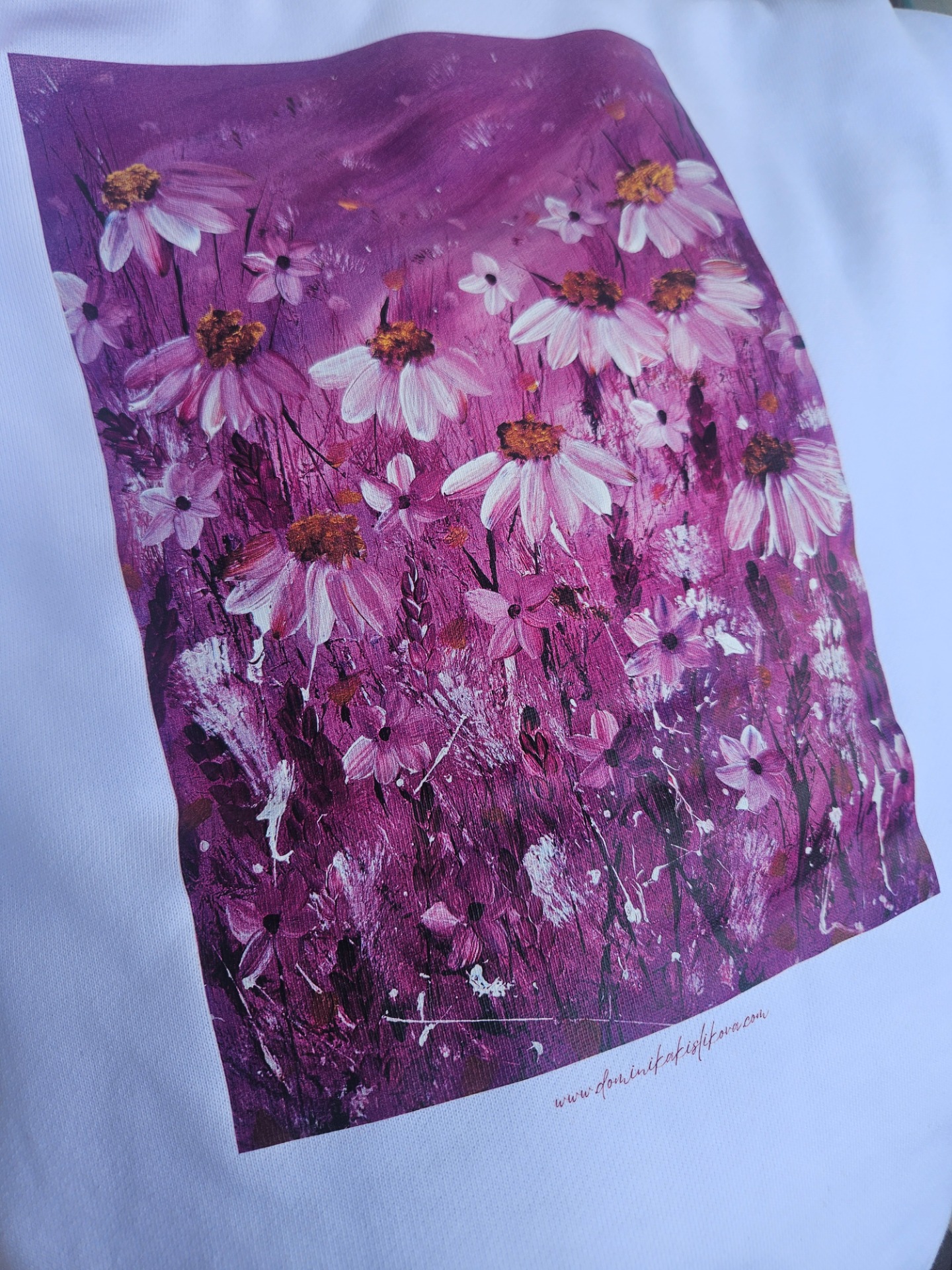 Farebná mozaika kvetov rozdelená do geometrických blokov vytvára výrazný kontrast a zároveň harmonický celok. Kombinácia sýtych odtieňov ružovej, fialovej, modrej, červenej a oranžovej pôsobí dynamicky a usporiadane.